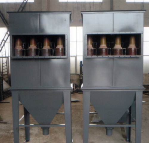 該除塵器為旋風(fēng)類除塵器,當(dāng)含塵氣體進入除塵器,通過陶瓷導(dǎo)向器,在旋風(fēng)子內(nèi)部高速旋轉(zhuǎn),在離心力的作用下,粉塵和氣體分離,粉塵降落在集塵箱內(nèi),經(jīng)放灰閥排出,凈化的氣體形成上升的旋流,通過排氣管匯于集氣室,經(jīng)出口由煙囪排出,達到除塵效果。
